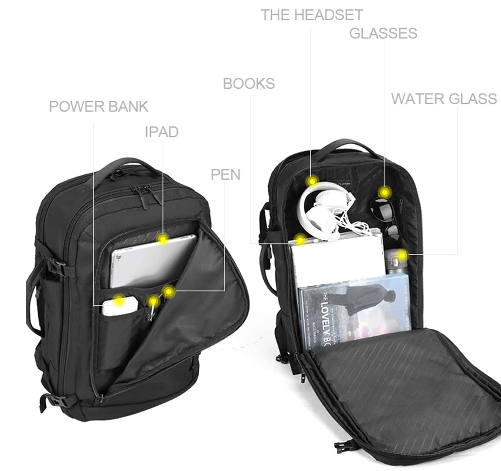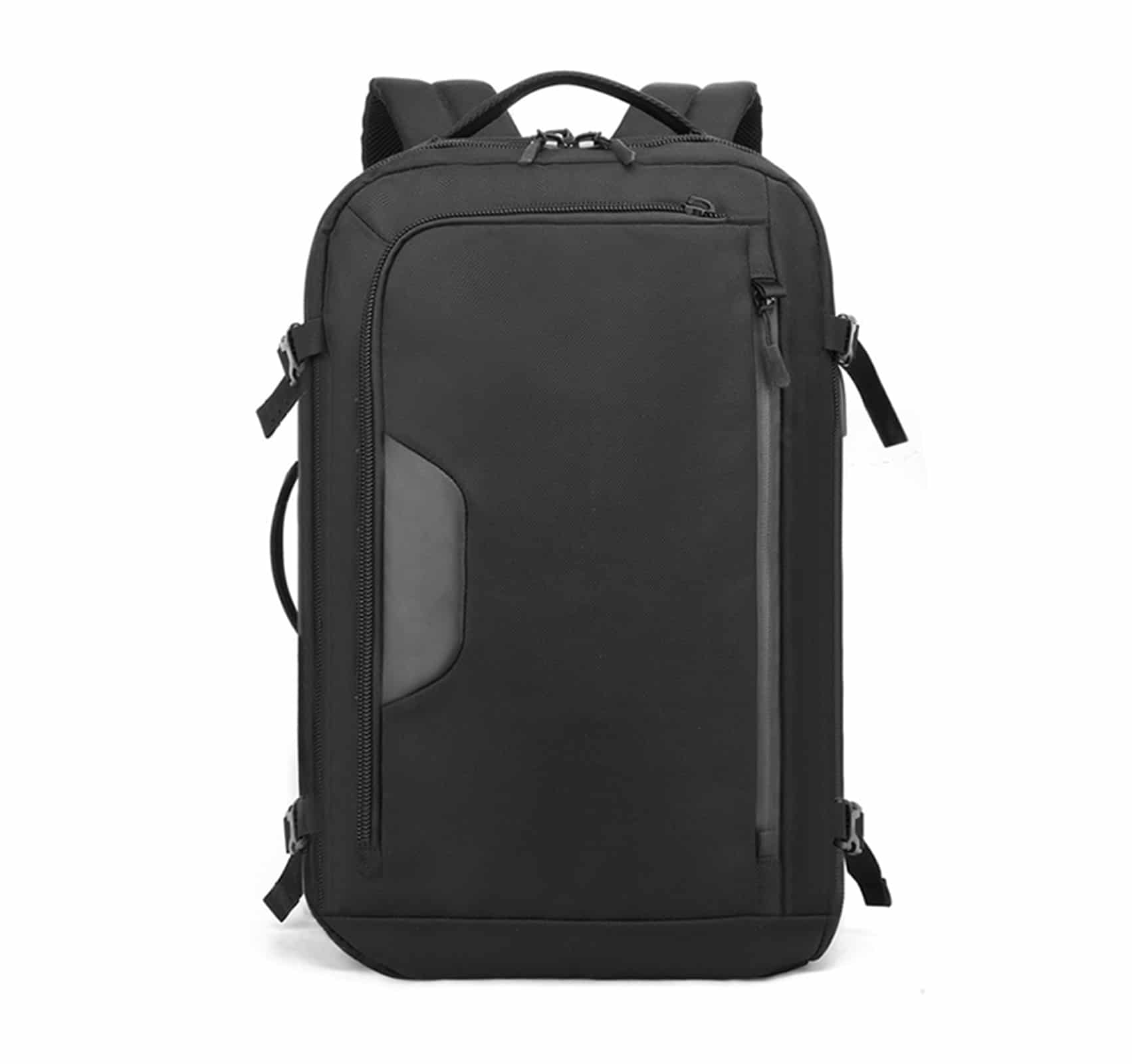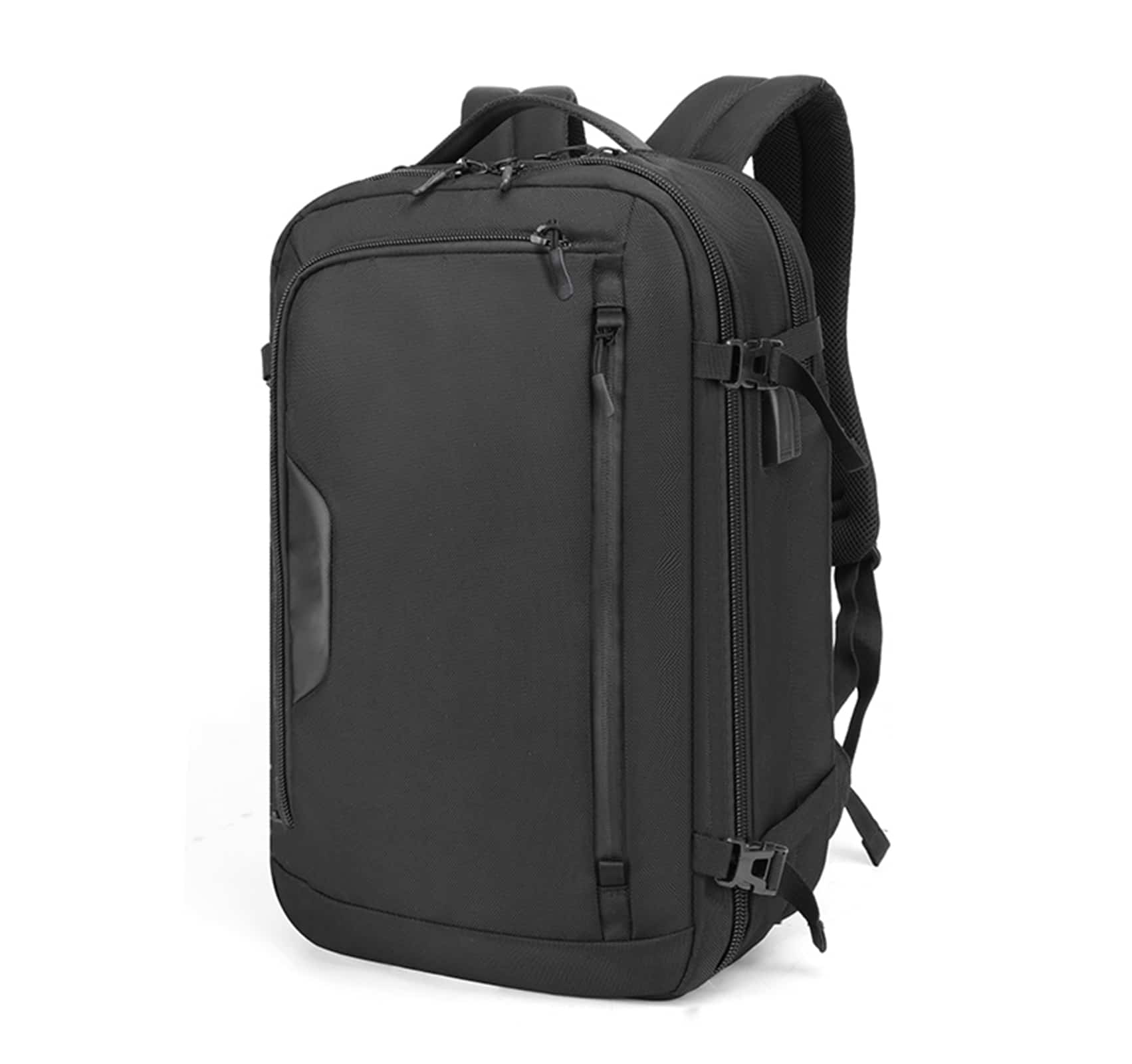 Рюкзак з відділенням для ноутбука 15,6” та відділенням для ipad .Тканина водонепроникний 100% поліестер + PU, має USB Port, великий відділ з еластичними ремінями для одягу та різні кармани-органайзери, прихована кишеня на лямці для карток, бокова кишеня для пляшки, на задній спинці ремінь для валізи. Рюкзак має крім вертикальної ручки горизонтальну і може трансформуватися в сумку, при цьому задні лямки ховаються в приховане відділленя.