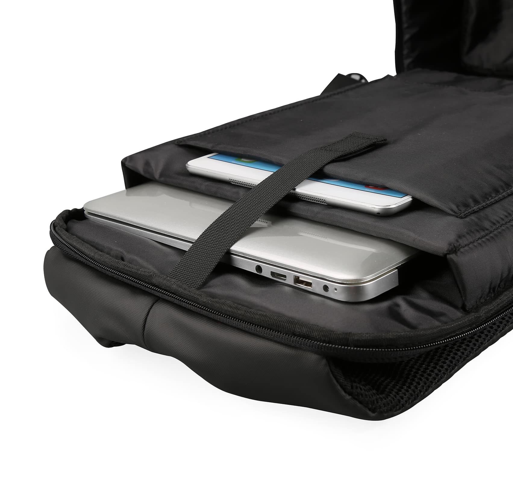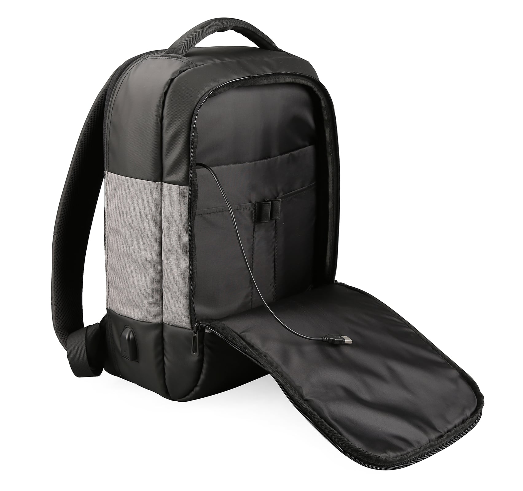 Рюкзак антизлодій для ноутбука 15,6” та планшету .Тканина водонепроникний 100% поліестер фібра + поліуретан, має USB Port, основний великий відділ та різні кармани органайзери, дві бокові кишені, ремінь для валізи, на лямці – тримач для телефона.