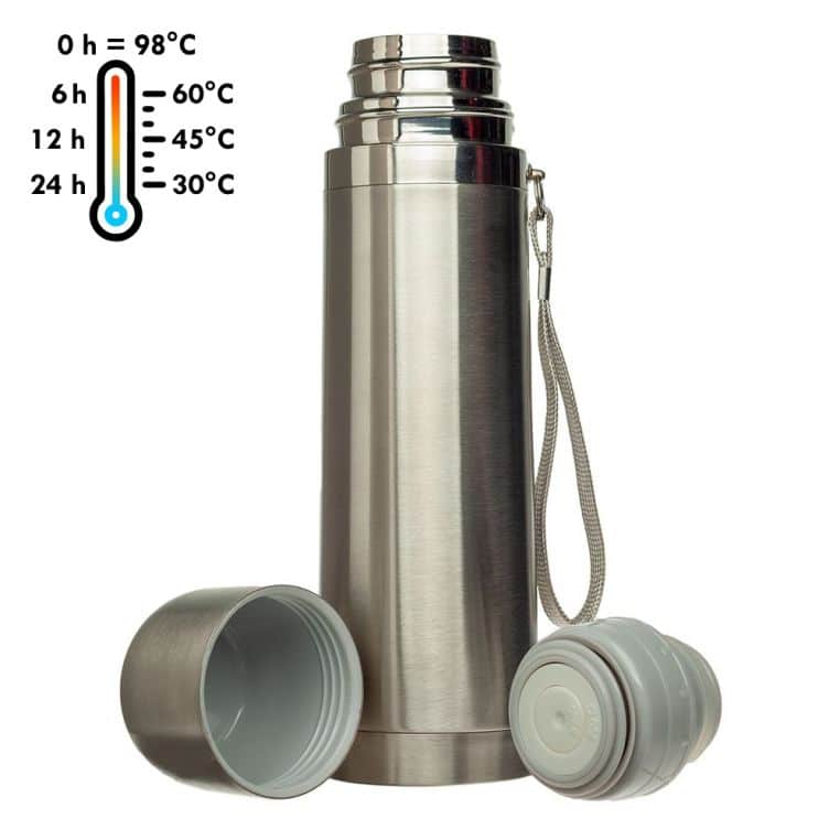 Термос із подвійними стінками з нержавіючої сталі. На корпусі є ремінець на руку. Кришку термоса можна використовувати як чашку.