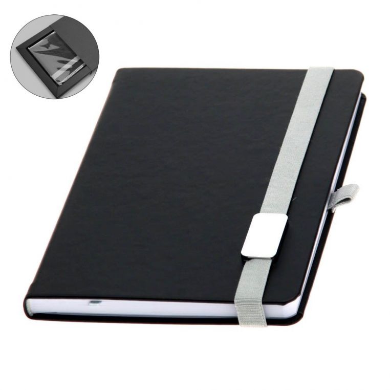 Записна книжка на резинці з металевим шильдом і блоком білого кольору у лінійку. Тверда обкладинка.